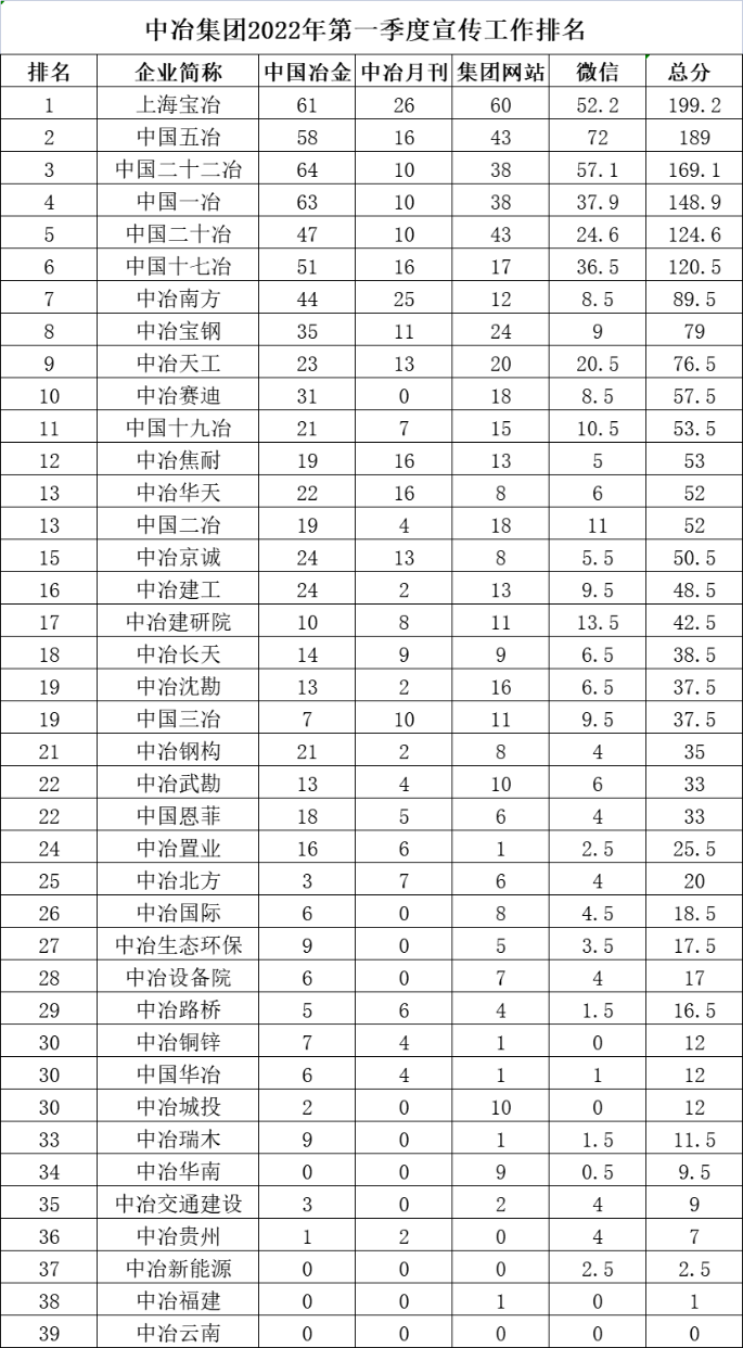 中冶集團2022年第一季度宣傳工作排名