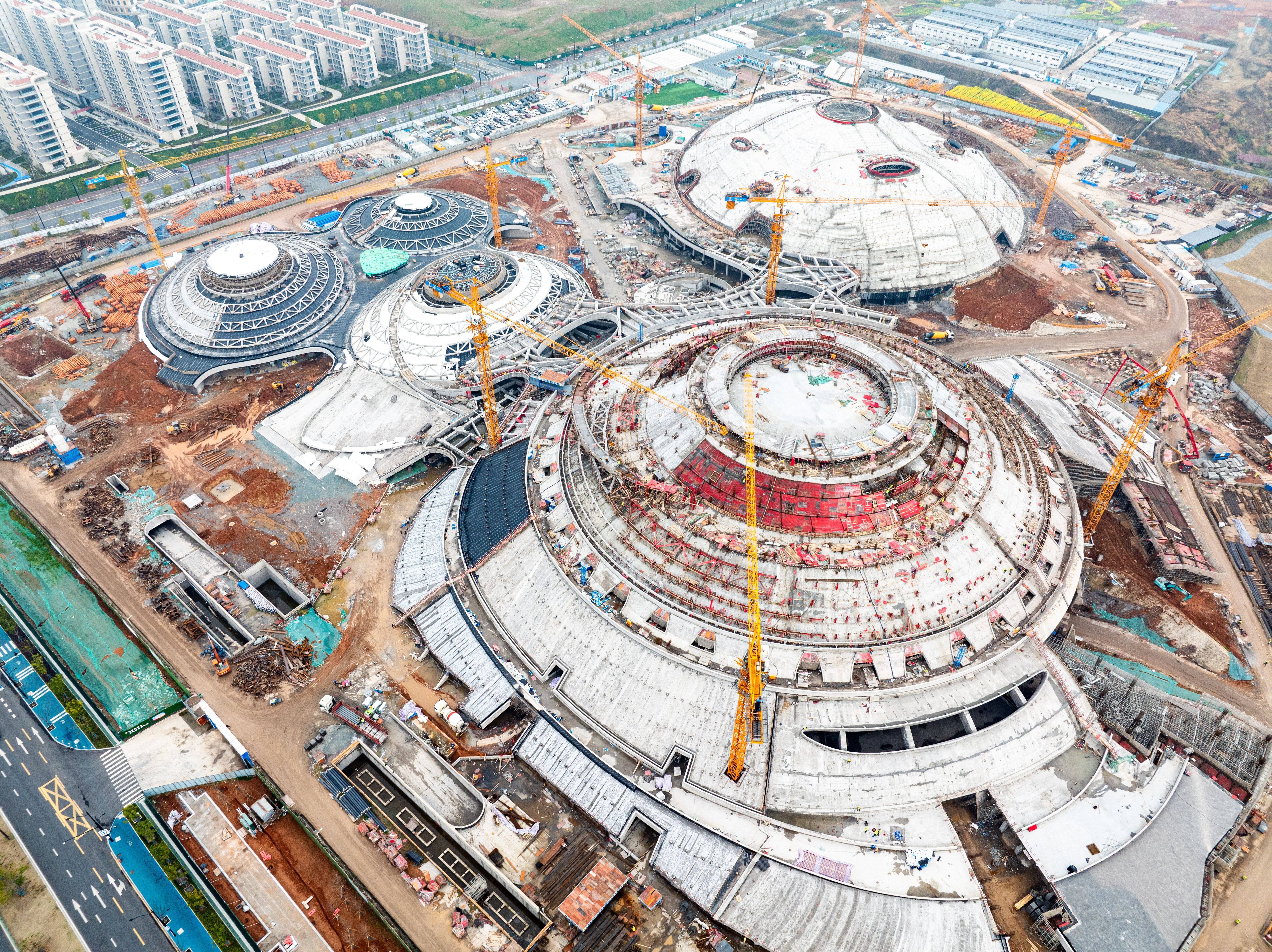 由中國十七冶承建的蘭州奧體中心,采用“飛天花舞”設計理念,建筑猶如五朵花舞動于絲綢之路上,總建筑面積46.6萬平方米,由60000座玫瑰體育場、8000座郁金香綜合館、3000座百合游泳館、3000座荷花網球館、蘭花運動員公寓等單體組成。其中郁金香綜合館弦支穹頂是世界上首個吊掛大噸位斗形屏(40t)的矢跨比小于1/12的90米級大跨度弦支穹頂結構工程。